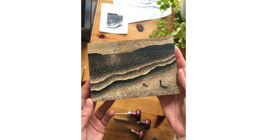 I mainly work in linocut and wood engraving. I love the repetitive processes of printmaking and find it extremely meditative. I have a lot of patience for repetitive tasks and enjoy focusing in on the tiny details of my work.