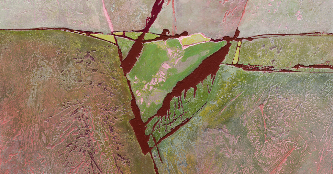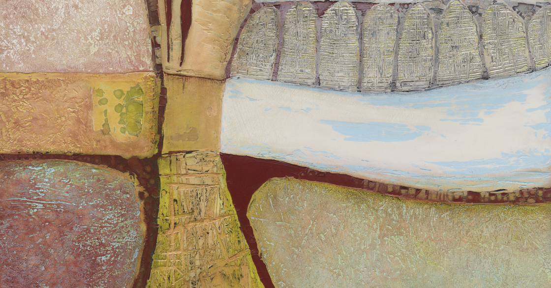 Working with limestone and marble plaster, acrylic and ground rock, Sandercock creates paintings that shimmer with depth and light. Natural muscovite mica, often incorporated into her work, catches the light beautifully like sunlight on waves or a seam of quartz hidden in stone.